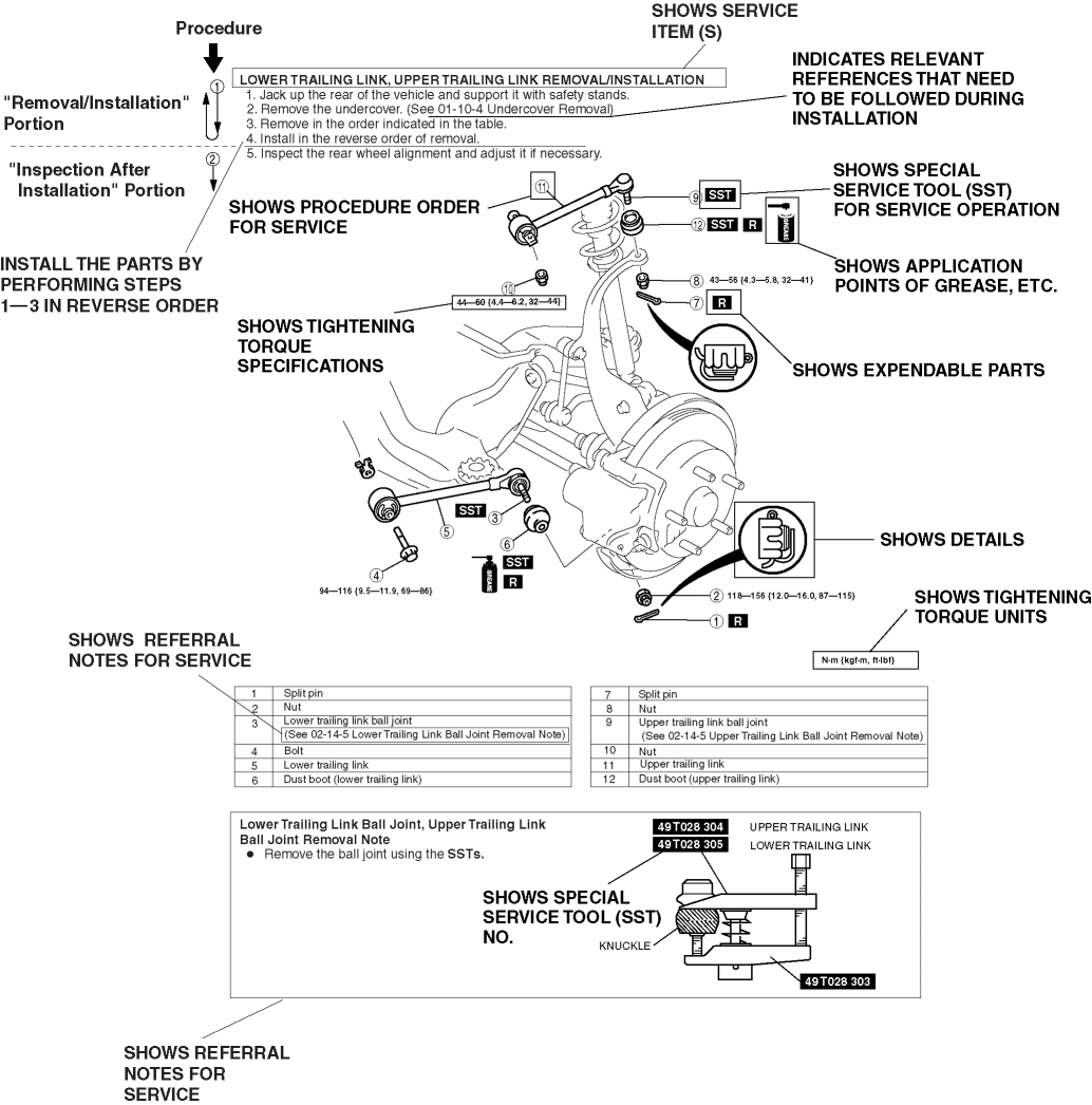 2. Expendable parts, tightening torques, and symbols for oil, grease, and sealant are shown in the overview illustration. In addition, symbols indicating parts requiring the use of special service tools or equivalent are also shown.