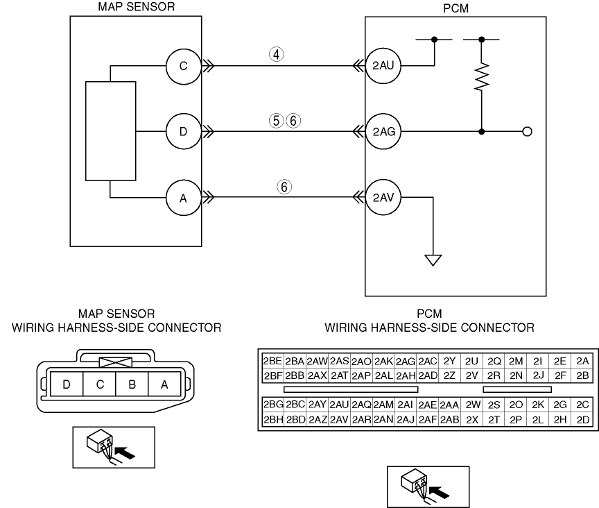 • Short to ground in wiring harness between MAP sensor terminal D and PCM terminal 2AG