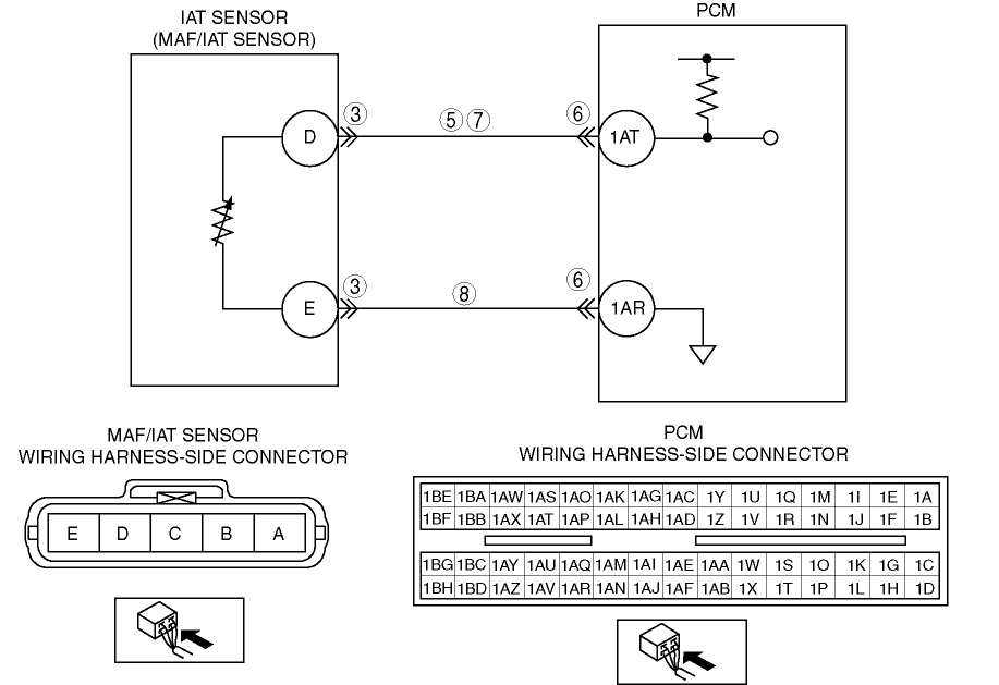 • Inspect for continuity between MAF/IAT sensor terminal D (wiring harness-side) and PCM terminal 1AT.