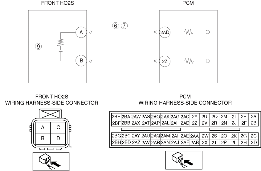 • Inspect for continuity between PCM terminal 2AD (wiring harness-side) and front HO2S terminal A (wiring harness-side).