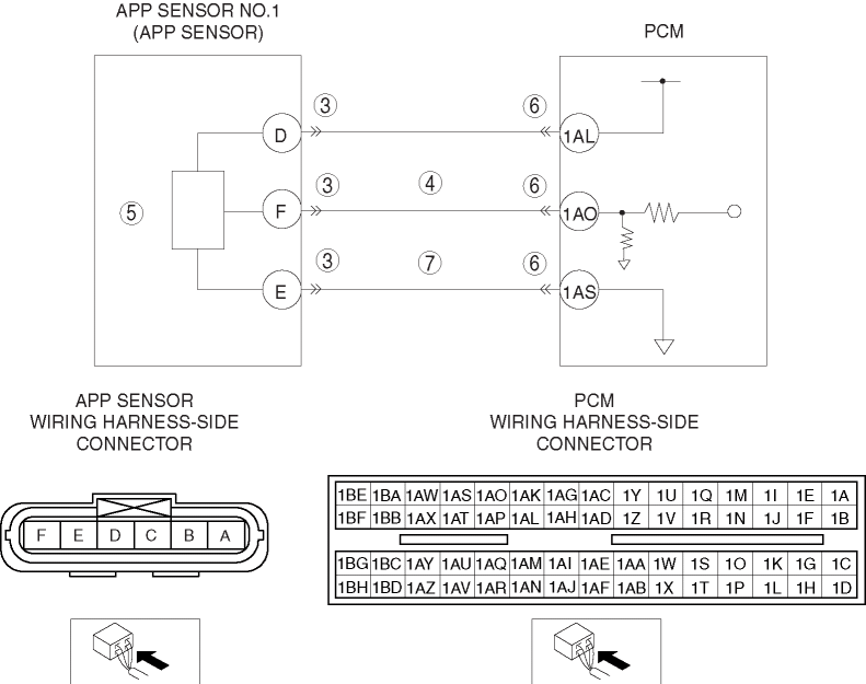 • Short to power supply in wiring harness between APP sensor terminal F and PCM terminal 1AO