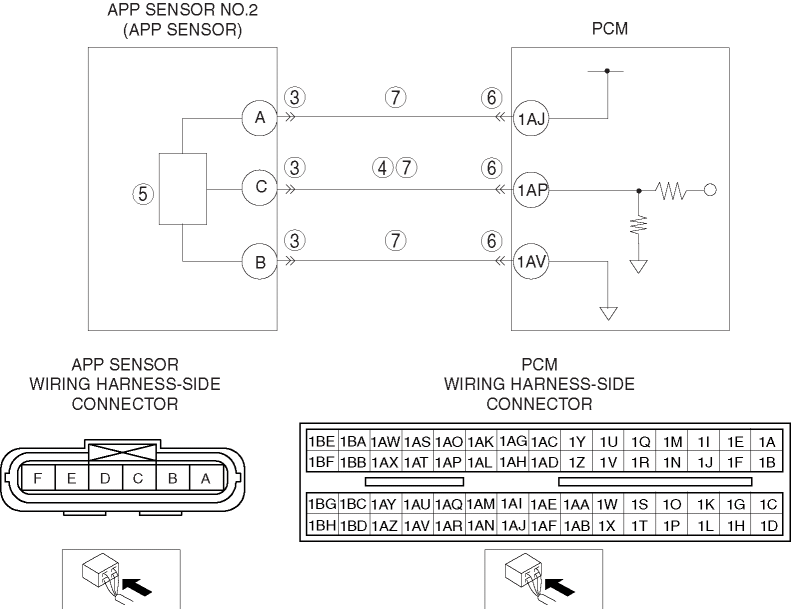 • APP sensor terminal B (wiring harness-side) and PCM terminal 1AV