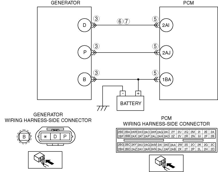 • Short to power circuit between generator connector terminal D and PCM connector terminal 2AI