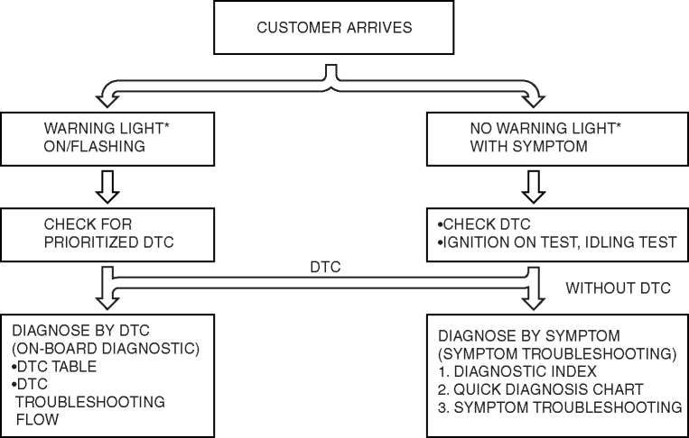 When the customer reports a vehicle malfunction, check the malfunction indicator lamp (MIL) indication and diagnostic trouble code (DTC), then diagnose the malfunction according to the following flowchart: