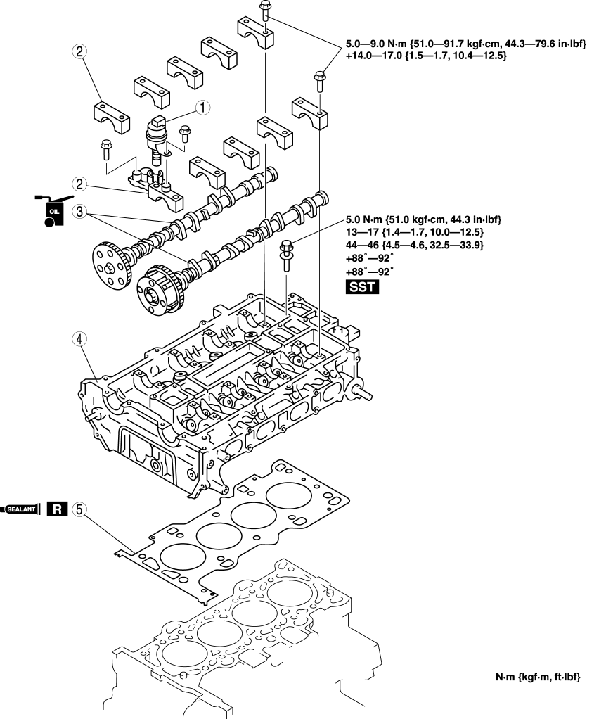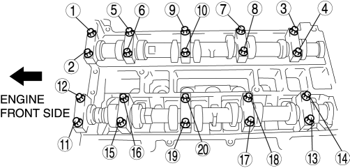 5. Tighten the camshaft cap bolts in the order shown with the following two steps.
