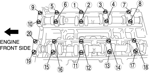 1. Loosen the camshaft cap bolts in several passes in the order shown.