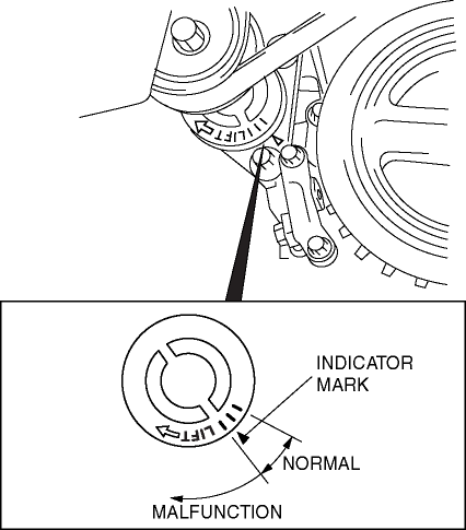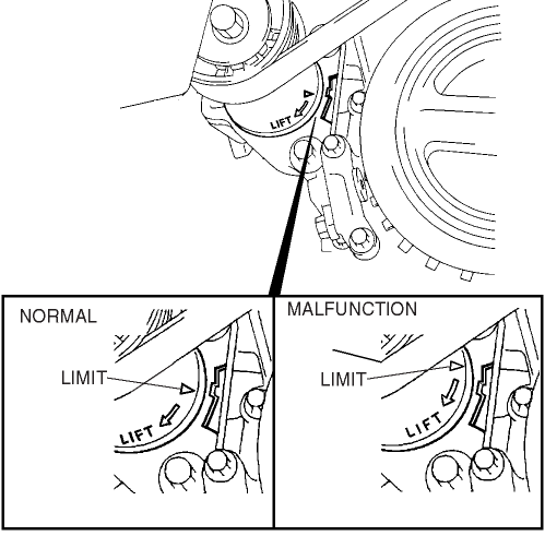 2. Verify that the drive belt auto tensioner indicator mark does not exceed the limit.