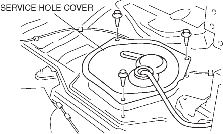 4. Perform the following procedure to remove the service hole cover.a. To remove the back trim, remove the following parts:i. Console (See CONSOLE REMOVAL/INSTALLATION.)ii. Quarter trim (See QUARTER TRIM REMOVAL/INSTALLATION.)iii. Scuff plate (SCUFF PLATE REMOVAL/INSTALLATION.)iv. Tire house trim (See TIRE HOUSE TRIM REMOVAL/INSTALLATION.)v. Aeroboard (See AEROBOARD REMOVAL/INSTALLATION.)vi. Front seat back bar garnish (See SEAT BACK BAR GARNISH REMOVAL/INSTALLATION.)b. Remove the back trim. (See BACK TRIM REMOVAL/INSTALLATION.)c. Remove the service hole cover.