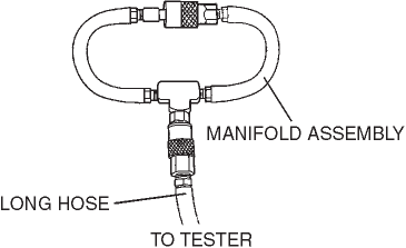 a. Verify the gas cylinder valve is closed and the control valve located on the tester is in the TEST position. All tester display should be off at this time.b. Connect the long hose (part of SST) to the tester.c. Connect the manifold assembly (part of SST) to the long hose as shown.d. Open the gas cylinder valve and verify the gas cylinder regulator left gauge reads 10 to 12 psi (preset at factory).