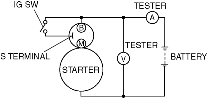 2. Connect the starter, battery, and a tester as shown in the figure.