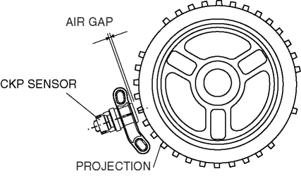 2. Using a thickness gauge, measure the air gap between the plate projections at the back of crankshaft pulley and the CKP sensor.