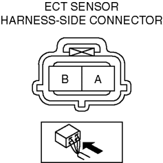 5. Place the ECT sensor in the water and while increasing the water temperature, measure the resistance between ECT sensor terminals A and B.