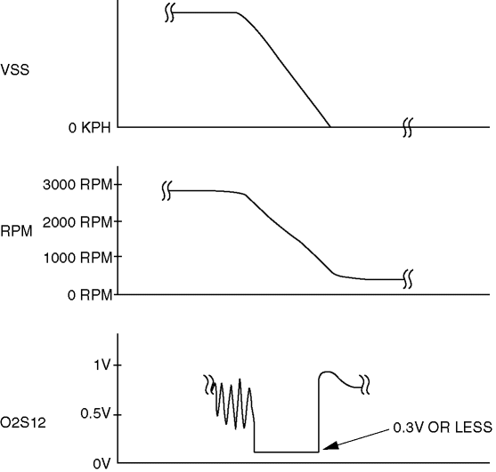 4. Verify that the rear HO2S outputs a voltage of 0.6 V or more, one time or more, then verify that the rear HO2S voltage (PID: O2S12) is 0.3 V or less while decelerating as shown in the figure.