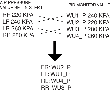 7. Determine which wheel unit identification code matches which wheel and tire by comparing the PID monitor values with the air pressure values set in Step 1.