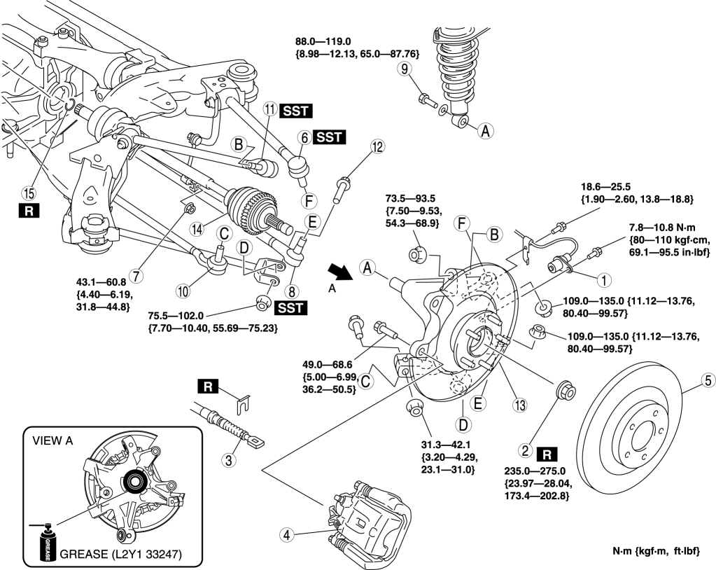 1. Apply grease (L2Y1 33247) to the wheel bearing inner race and drive shaft contact surface (Area A in figure).
