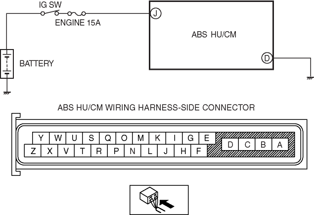 • Open circuit or short to ground in the wiring harness between the ABS HU/CM terminal J and the battery
