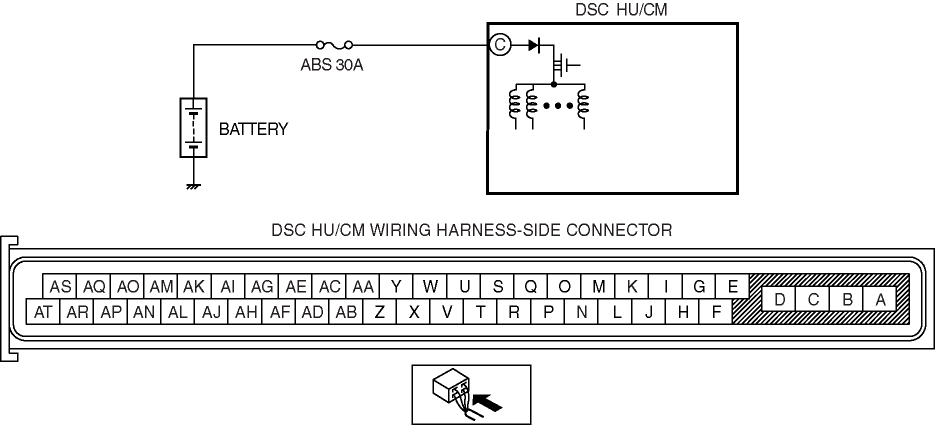 • Measure voltage between DSC HU/CM terminal C (harness-side) and ground.