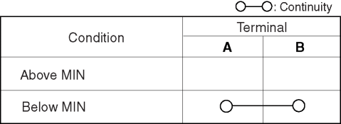 2. Inspect for continuity according to fluid level between the brake fluid level sensor terminals.