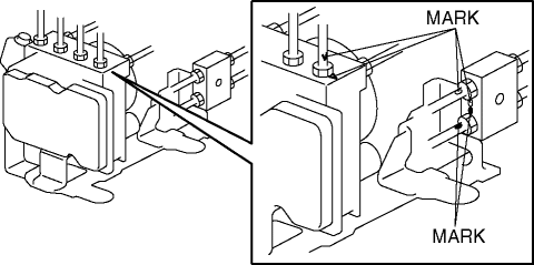 1. Align with the mark made before removing the brake pipe and temporarily install the brake pipe to the ABS HU/CM.CAUTION: