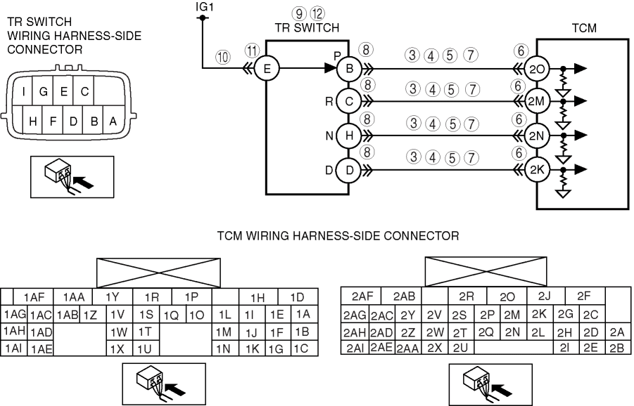 • Open circuit in wiring harness between TR switch terminal C and TCM terminal 2M