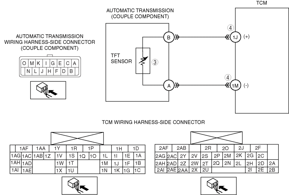 • Inspect for resistance between TCM terminals 1J and 1M (wiring harness-side).