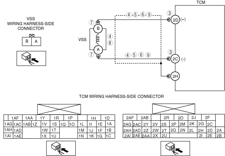• Short to ground in wiring harness between VSS terminal B and TCM terminal 2D