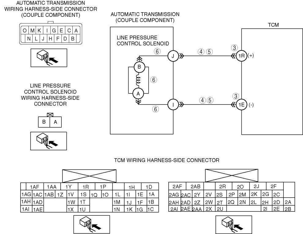 • Short to power in wiring harness between line pressure control solenoid terminal B and TCM terminal 1R