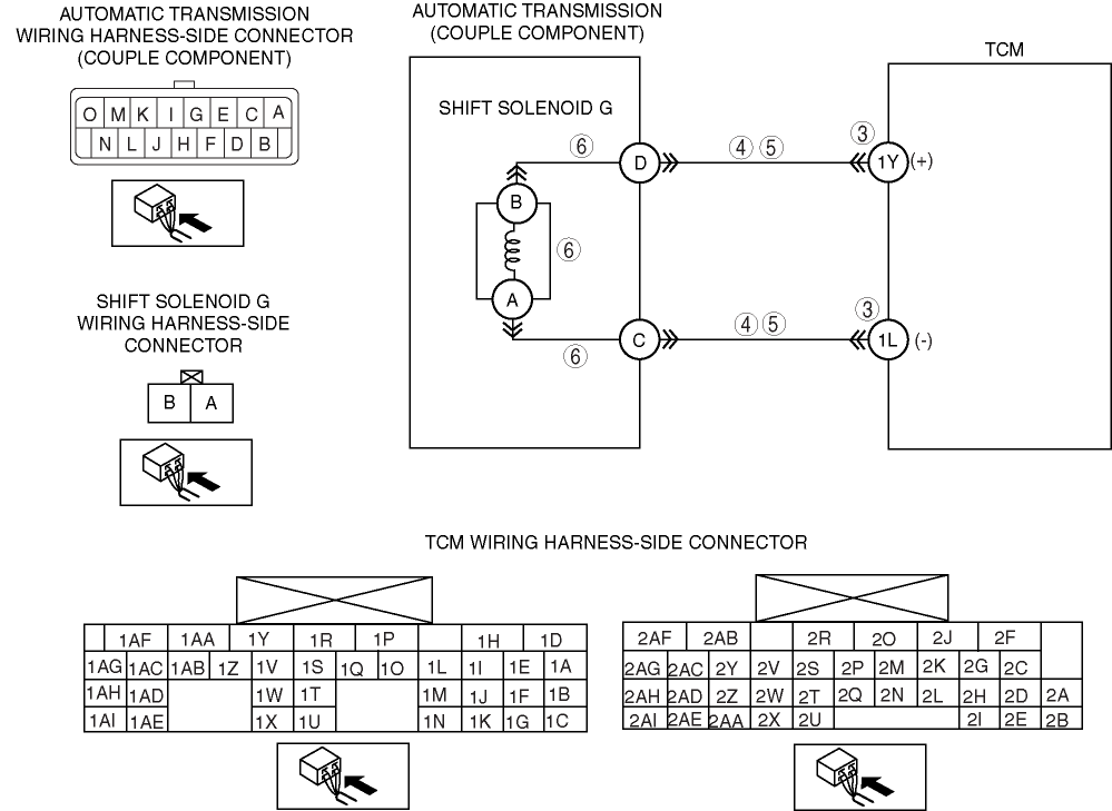 • Short to power in wiring harness between shift solenoid G terminal A and TCM terminal 1L