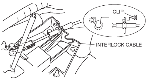 17. Fit the interlock cable in the U-groove in the selector lever base plate and install the clip.
