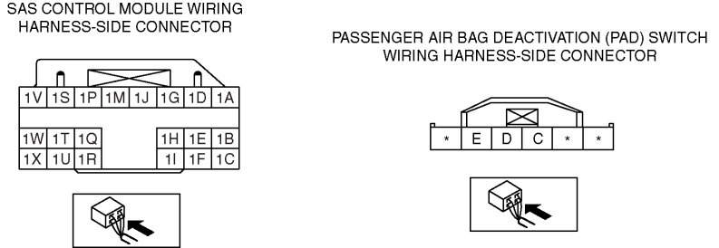• Inspect the wiring harness between SAS control module terminal 1Q and PAD switch terminal D, SAS control module terminal 1H and PAD switch terminal C for the following: