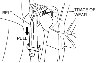 1. If the vehicle has been subjected to a shock in an accident, pull the belt from the retractor and confirm that there are no wear tracks (the load limiter has not operated) by visually inspecting and feeling the belt.