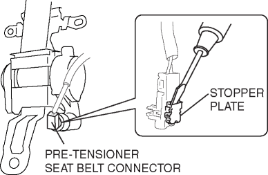5. Using a screwdriver, pry out the pre-tensioner seat belt connector stopper plate.