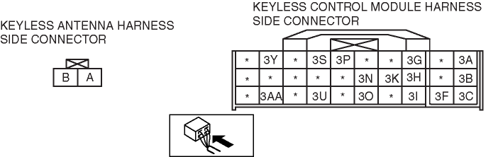 • Open or short circuit in wiring harness between keyless control module and keyless antenna