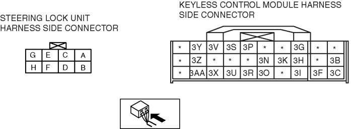 • Is there continuity between keyless control module terminal 3N and steering lock unit terminal A?