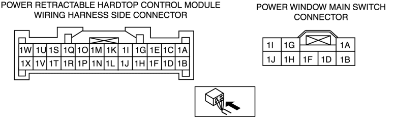• Inspect for continuity between power retractable hardtop control module connector terminal 1E and power window main switch terminal 1A, and between power retractable hardtop control module connector terminal 1C and power window main switch terminal 1H