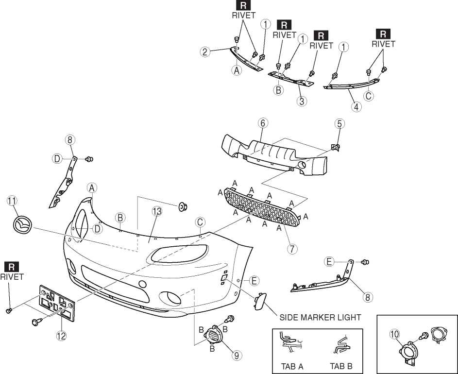 1. To disassemble the front bumper, remove the following parts:a. Front fog lights (Vehicles with the front fog lights) (See FRONT FOG LIGHT REMOVAL/INSTALLATION.)b. Front side marker light. (See FRONT SIDE MARKER LIGHT REMOVAL/INSTALLATION.)
