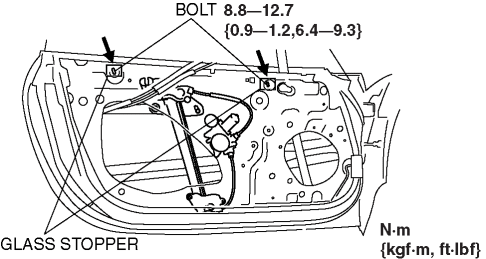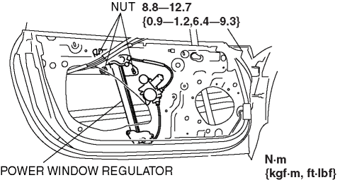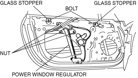 8. Lightly tighten the power window regulator and door glass tightening nuts.