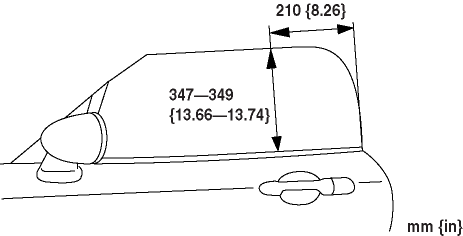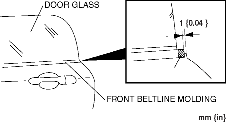 The standard position for the rear edge of the front beltline molding is 1 mm {0.04 in} from the rear edge of the door panel. If the standard position for the rear edge of the front beltline molding has deviated, align the rear edge of the door glass to the standard position for the rear edge position of the front beltline molding.