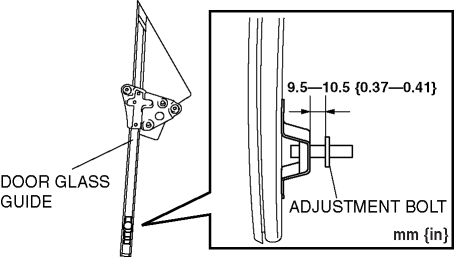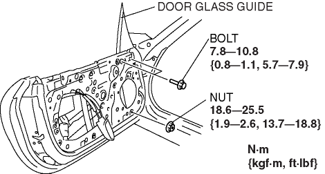 8. Remove the nut and bolt, then remove the door glass guide.(See Door Glass