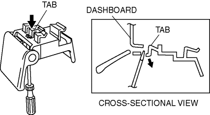 2. While pushing the tab in the direction of the arrow using a tape-wrapped, small flathead screwdriver, detach it from the dashboard.CAUTION: