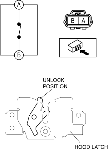 4. Inspect for continuity between the hood latch switch terminals A and B.