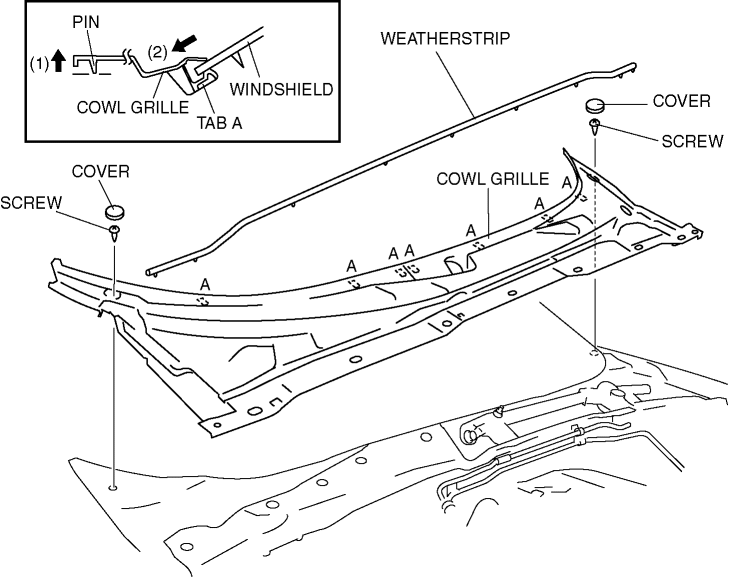 6. Pull the cowl grille in the direction of arrow (1) so that it is free from the pins, pull tabs A in the direction of arrow (2), and then remove the front window glass.