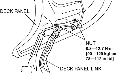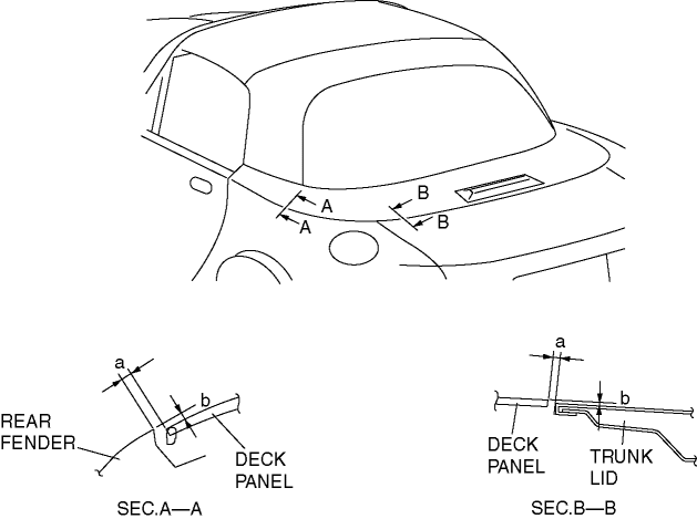 2. Adjust the gap and height difference between the deck panel and trunk lid within the specification by moving the deck panel back and forth, left and right, and by adjusting the number of shims if necessary.Clearance