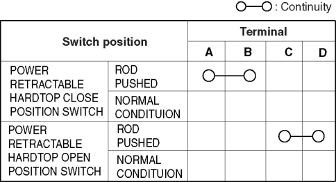 1. Verify that the continuity between the power retractable hardtop limit switch terminals is as indicated in the table.