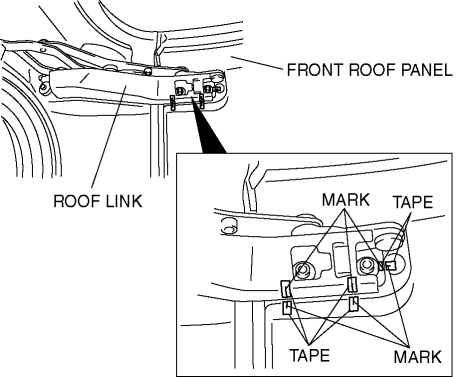 6. When removing the front roof panel, place the positioning mark by affixing masking tape on the roof link and front roof panel.