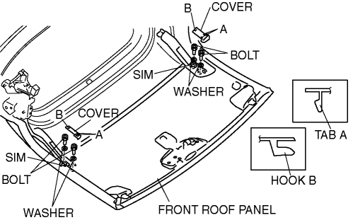 3. Refer to POWER RETRACTABLE HARDTOP ADJUSTMENT and verify that the gap and height difference between the front roof panel and middle roof panel are within the specifications. Adjust the power retractable hardtop if necessary. (See POWER RETRACTABLE HARDTOP ADJUSTMENT.)