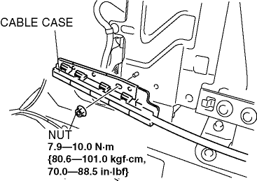 8. Loosen the nut, then pull the roof hook cable in the direction shown by the arrow and remove it.