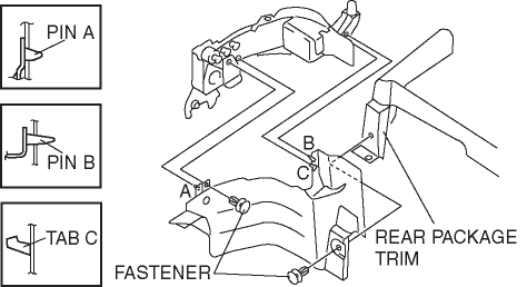 3. Pull the rear side trim outward and detach pins A, B and tab C.