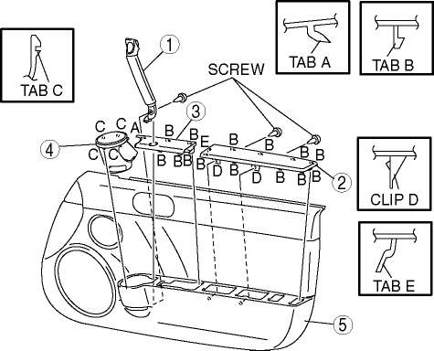 1. Disassemble in the order indicated in the table. 1 Handle pull 2 Armrest 3 Switch panel 4 Cup holder 5 Door trim