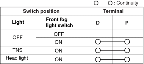 1. Verify that the continuity between the front fog light switch terminals is as indicated in the table.